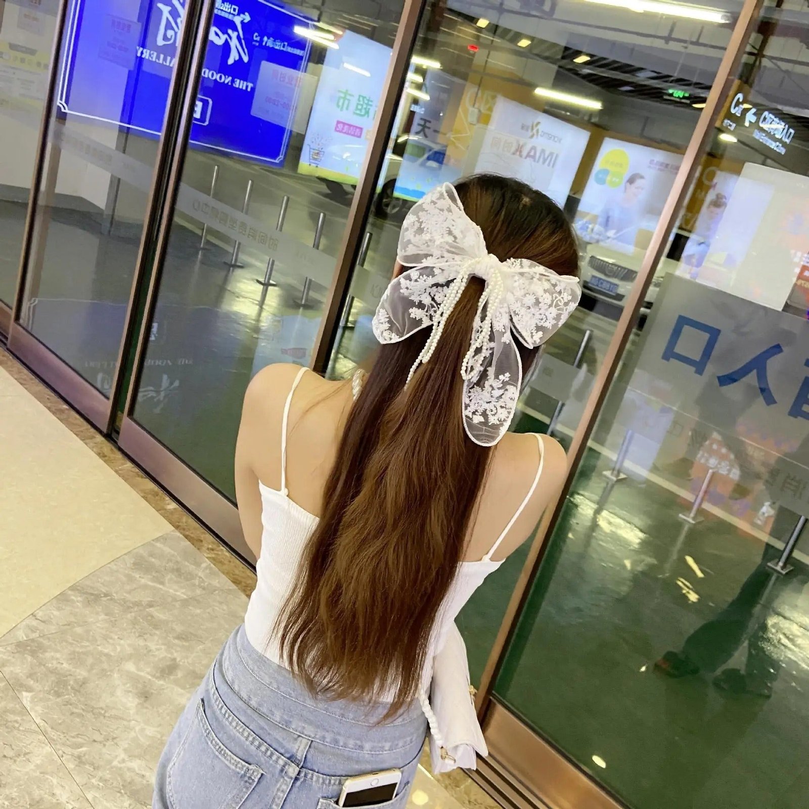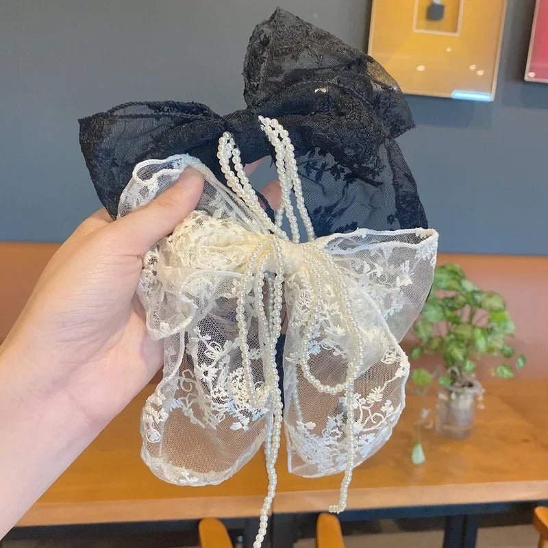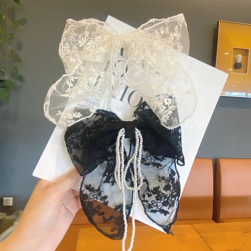 Add a touch of charm to your look with the lace bow hair clip from LIVSY. This accessory blends elegance and playful style. It features delicate lace shaped into a large bow. Fine details add sophistication to everyday fashion. A pearl ribbon drapes gracefully, offering a hint of shimmer that catches the light.